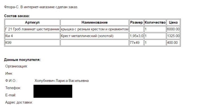 - Ну, а теперь самое низкое и мерзкое от этих нелюдей. На меня и моего сына Андрюшу кто-то дважды заказал гробы! В заказе также значились металлические кресты с позолотой, - рассказывает с ужасом корреспонденту нашего издания Лариса Холубкевич. - Также по телефону были два заказа на мое имя - ритуальные принадлежности и корзина с цветами для похорон! Это не смешно. Это настоящая травля и попытки запугать мою семью!