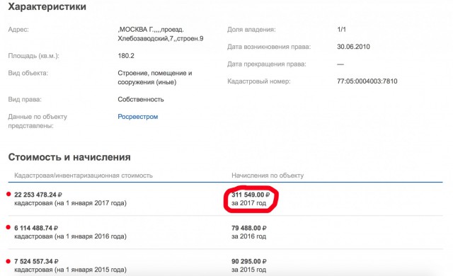 И вот совсем не уверен, что сегодня смогу его продать дороже. Хотя по данным налоговой оно должно стоить аж 22 253 478 рублей и 24 копейки. Ведь именно с этой суммы мне начисляют налог.